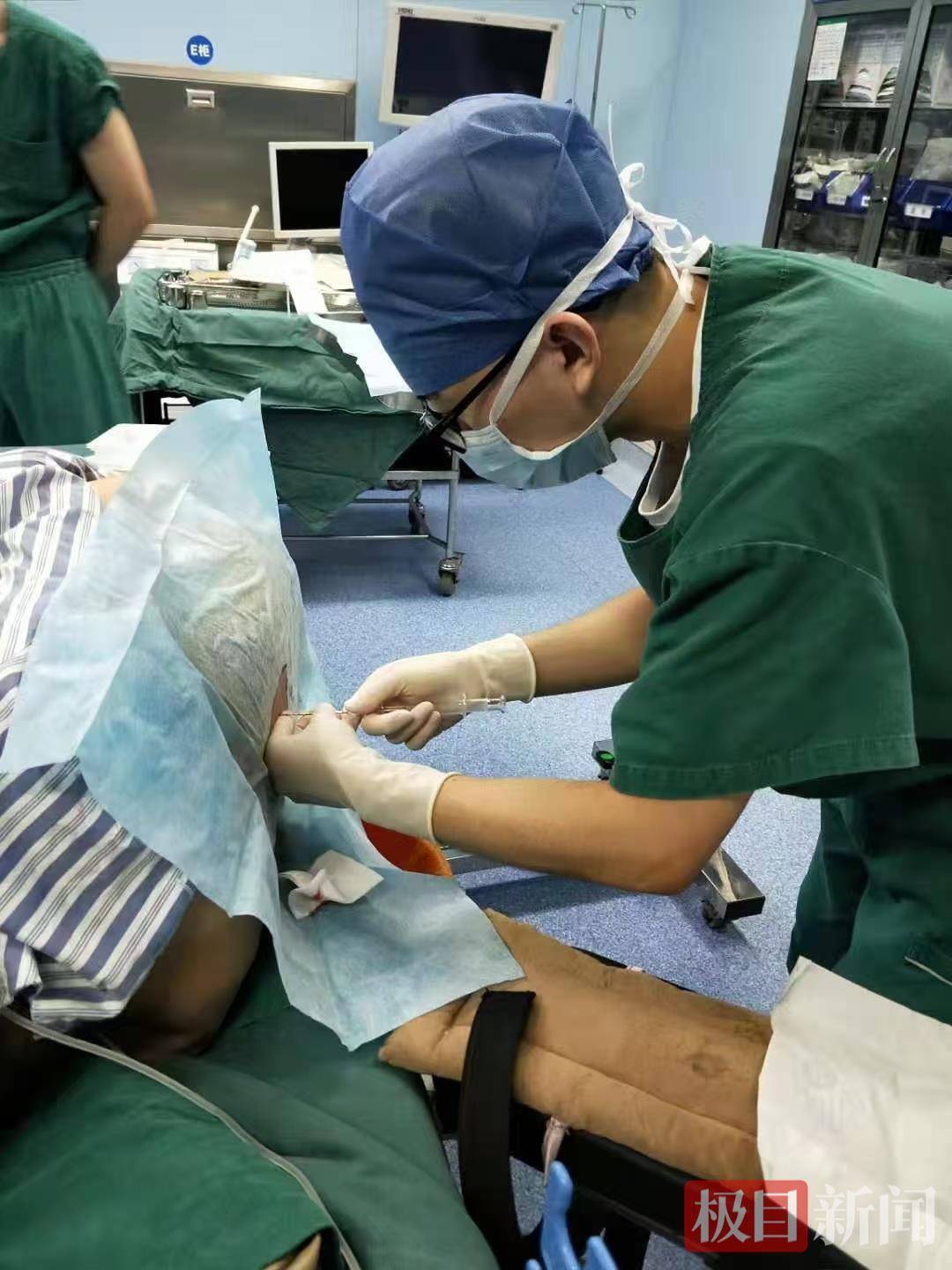 为快速减轻老人心脏负荷,两人小心将老人双腿抬高至高于心脏的水平,迅速为老人实施指尖放血急救。
